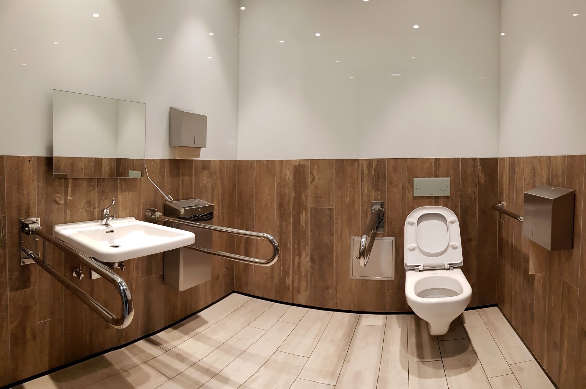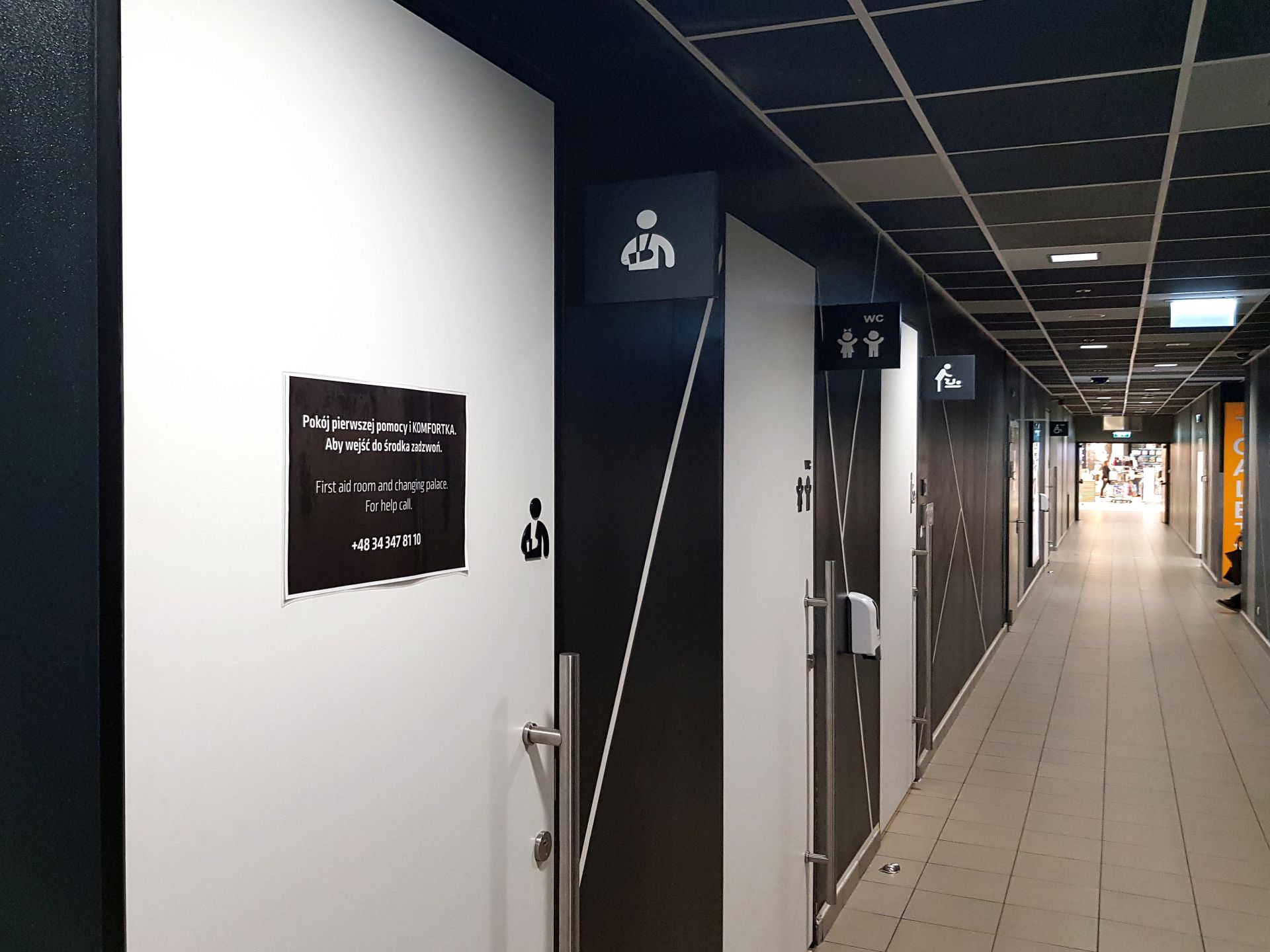 Wejście do niego pozbawione jest natomiast progu. Aby wejść do pomieszczenia należy zadzwonić na podany na drzwiach numer do infopunktu. W ten sposób zapewniona zostaje dodatkowa prywatność, ale także pełne bezpieczeństwo przebywających w nim osób. Komfortka sąsiaduje także z przystosowaną do potrzeb osób niepełnosprawnych toaletą oraz z toaletą dla opiekunów z dziećmi.