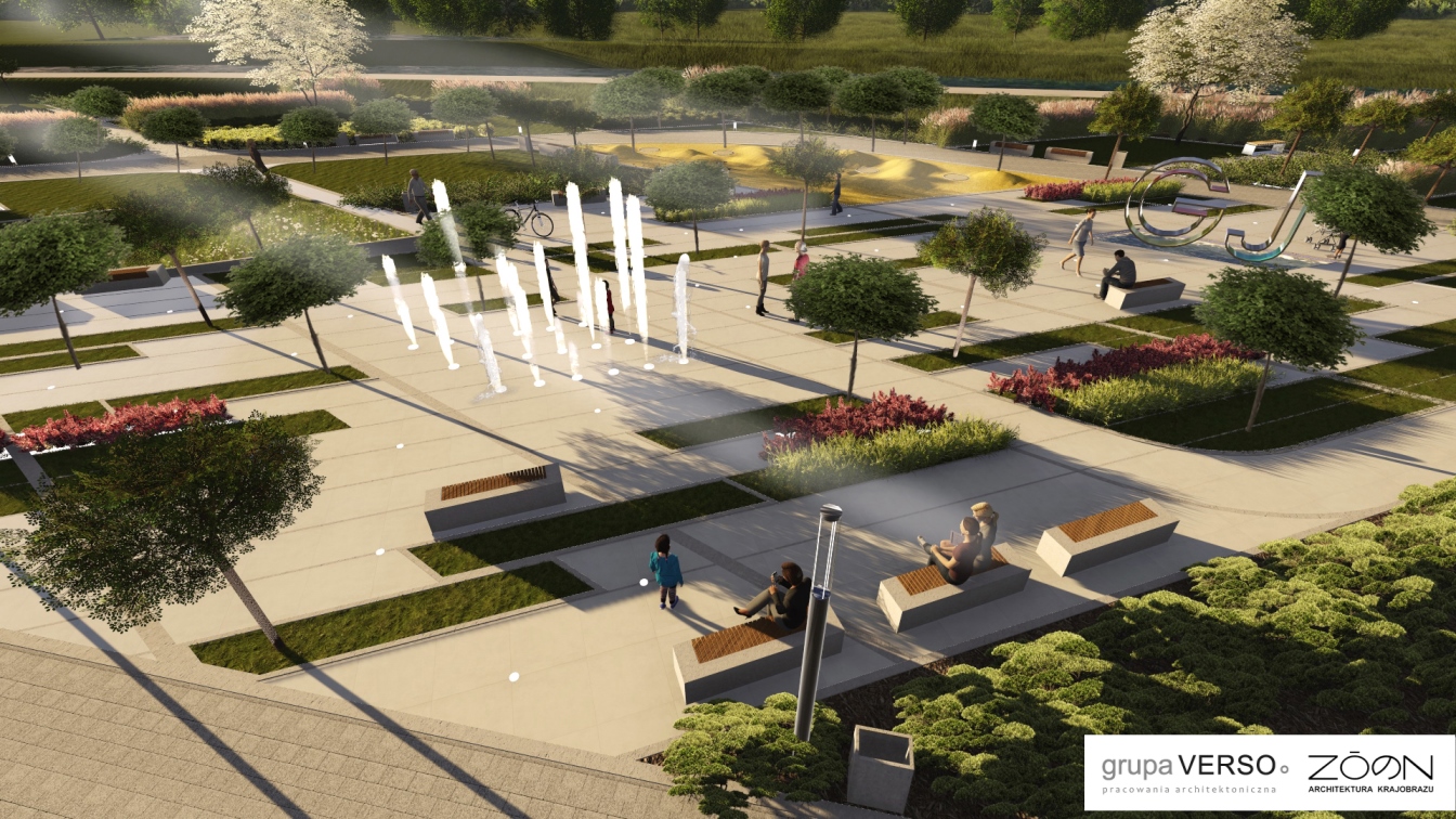 Powstają tutaj mające łącznie 1,3 tys. m kw. ścieżki i alejki spacerowe z ławkami, a także mające łącznie 300 m kw. place zabaw dla dzieci w różnym wieku, łączące edukację z rozrywką. W centralnym punkcie strefy znajdzie się z kolei mający 500 m kw. plac główny, na którym ulokowano tzw. mokry chodnik ze strzelającymi na kilka metrów strumieniami wody oraz prostokątną sadzawkę. Wokół placu ustawione zostaną ławki zwrócone w kierunku rzeki. Wzdłuż rzeki – począwszy od ronda do boisk do siatkówki plażowej prowadzić będzie natomiast długa, brukowana aleja spacerowa.
